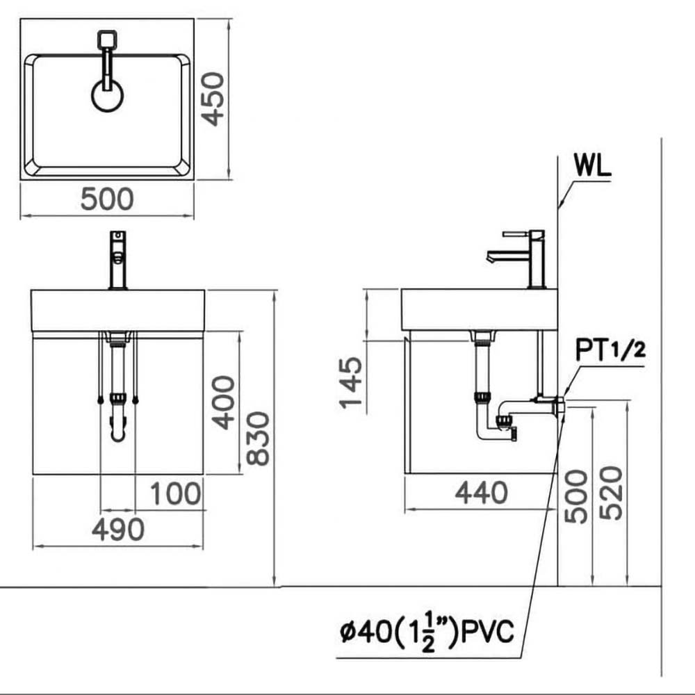 ♦ Kích thước lavabo: 450 x 500 x 115 mm