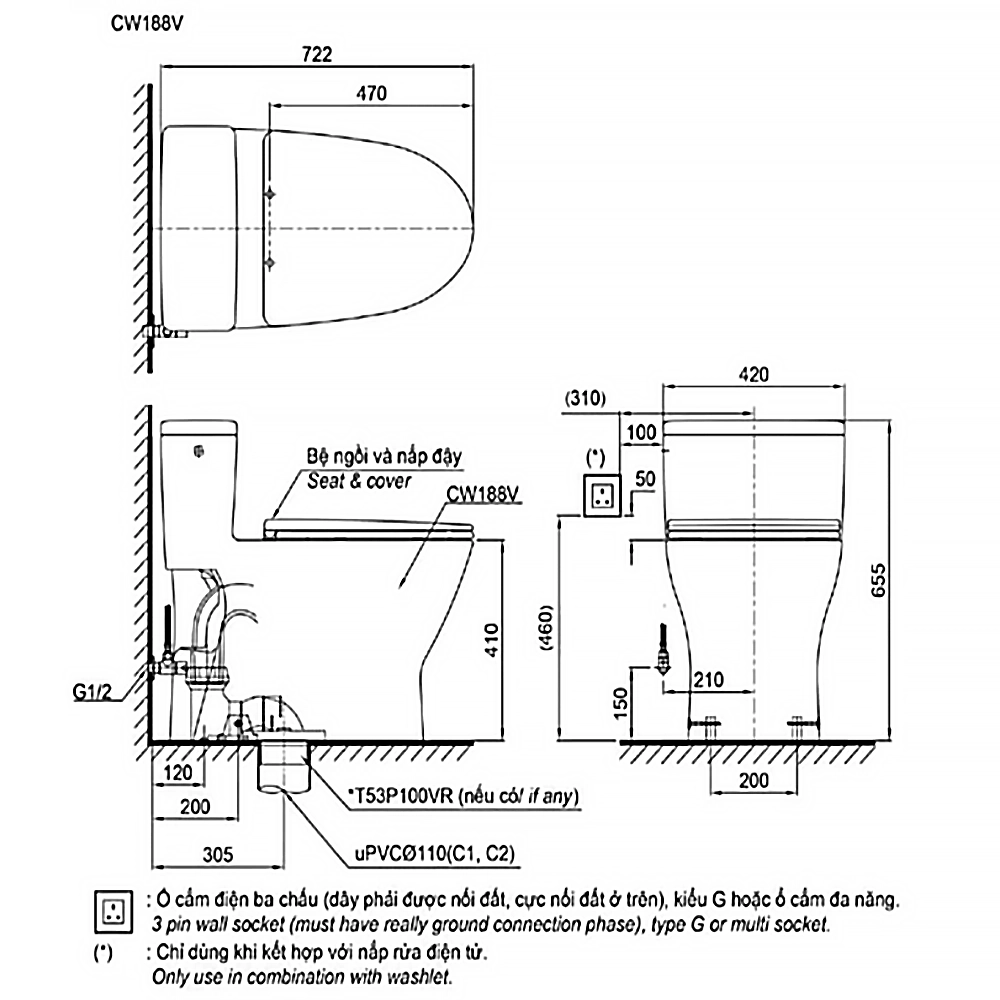 Bồn cầu TOTO MS188VKT2#XW/ T53P100VR 1 khối, nắp êm TC393VS