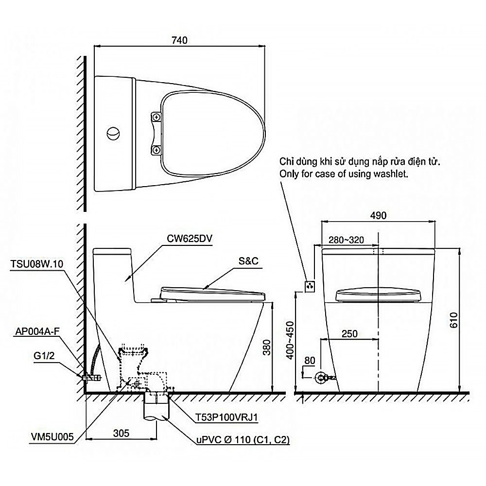 Bồn cầu TOTO MS625CDW23#XW 1 khối (Giấu dây), nắp điện tử TCF47360GAA