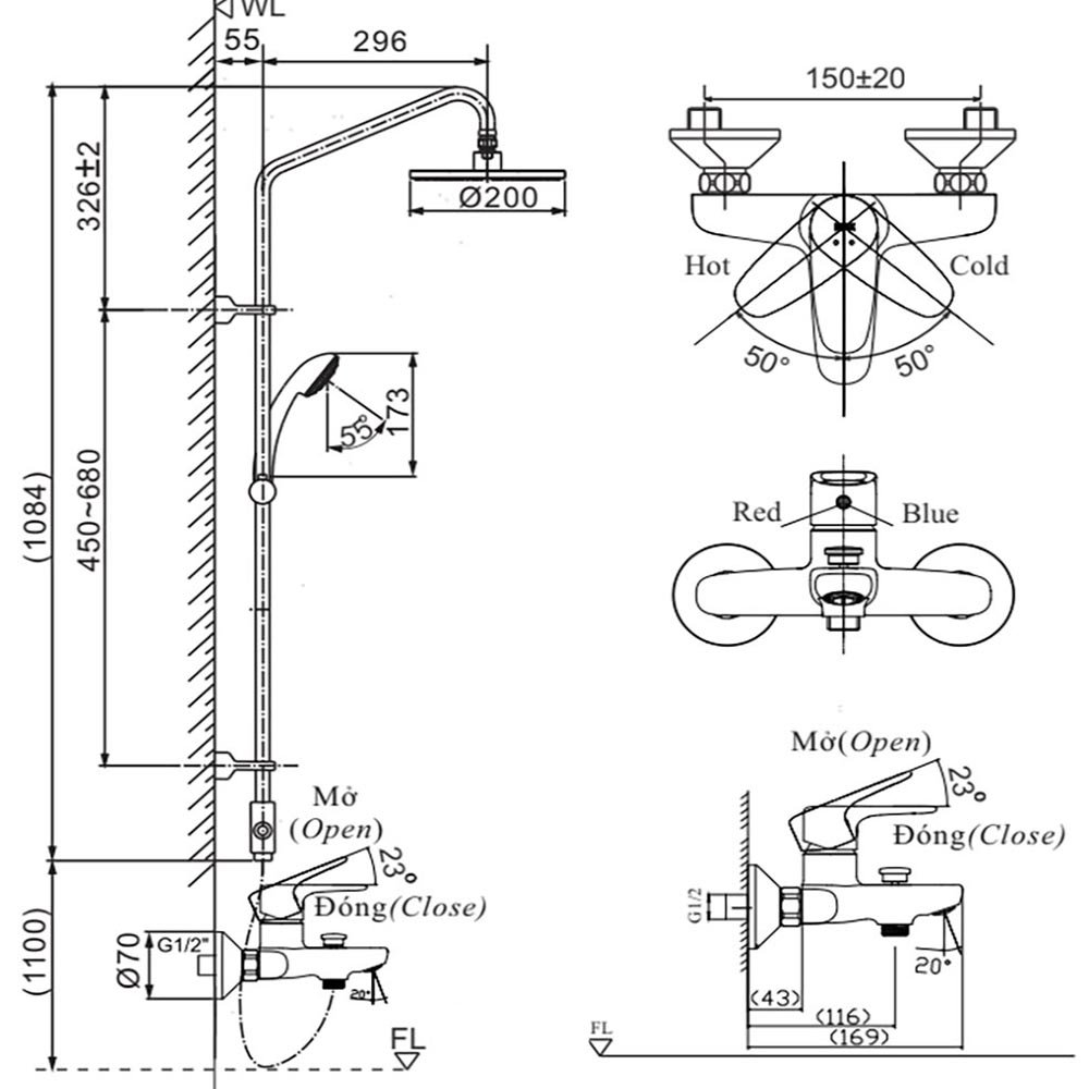 Sen cây INAX BFV-1405S (BFV1405S) nóng lạnh, tay sen 3C massage 5 chế độ
