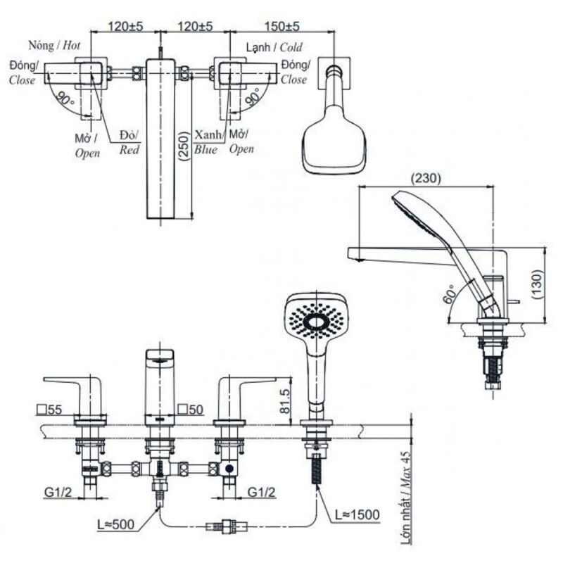 Vòi xả bồn tắm TOTO TBG03202B nóng lạnh, dòng GS (4 lỗ), màu Crom bóng, kèm tay sen