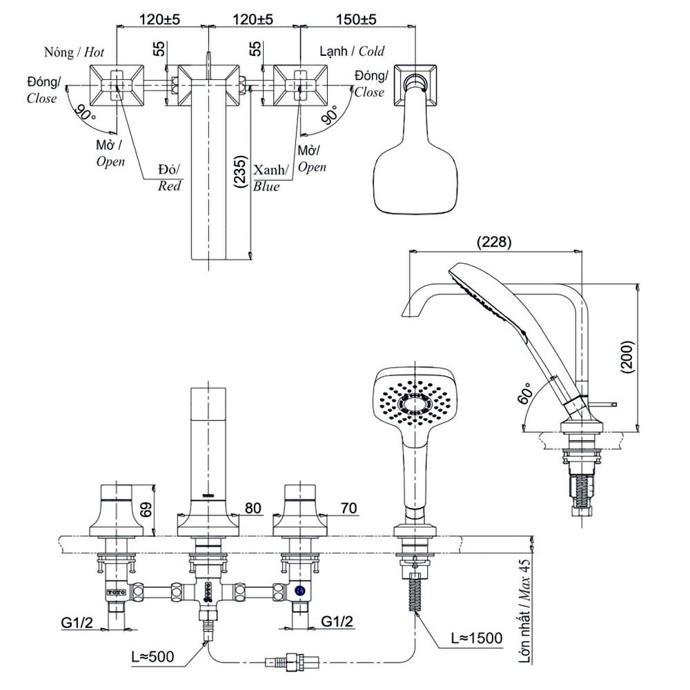Vòi xả bồn tắm TOTO TBG08305AA#MBL nóng lạnh, dòng GC (3 lỗ), màu đen mờ, kèm tay sen
